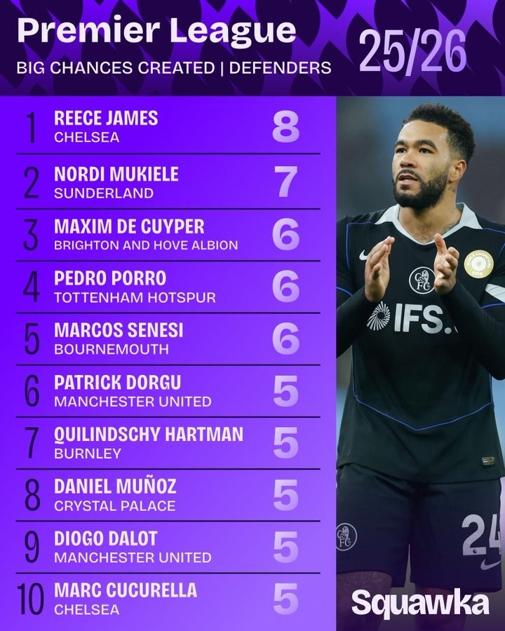 本赛季英超后卫创造重大机会榜:詹姆斯居首,多尔古、库库在列